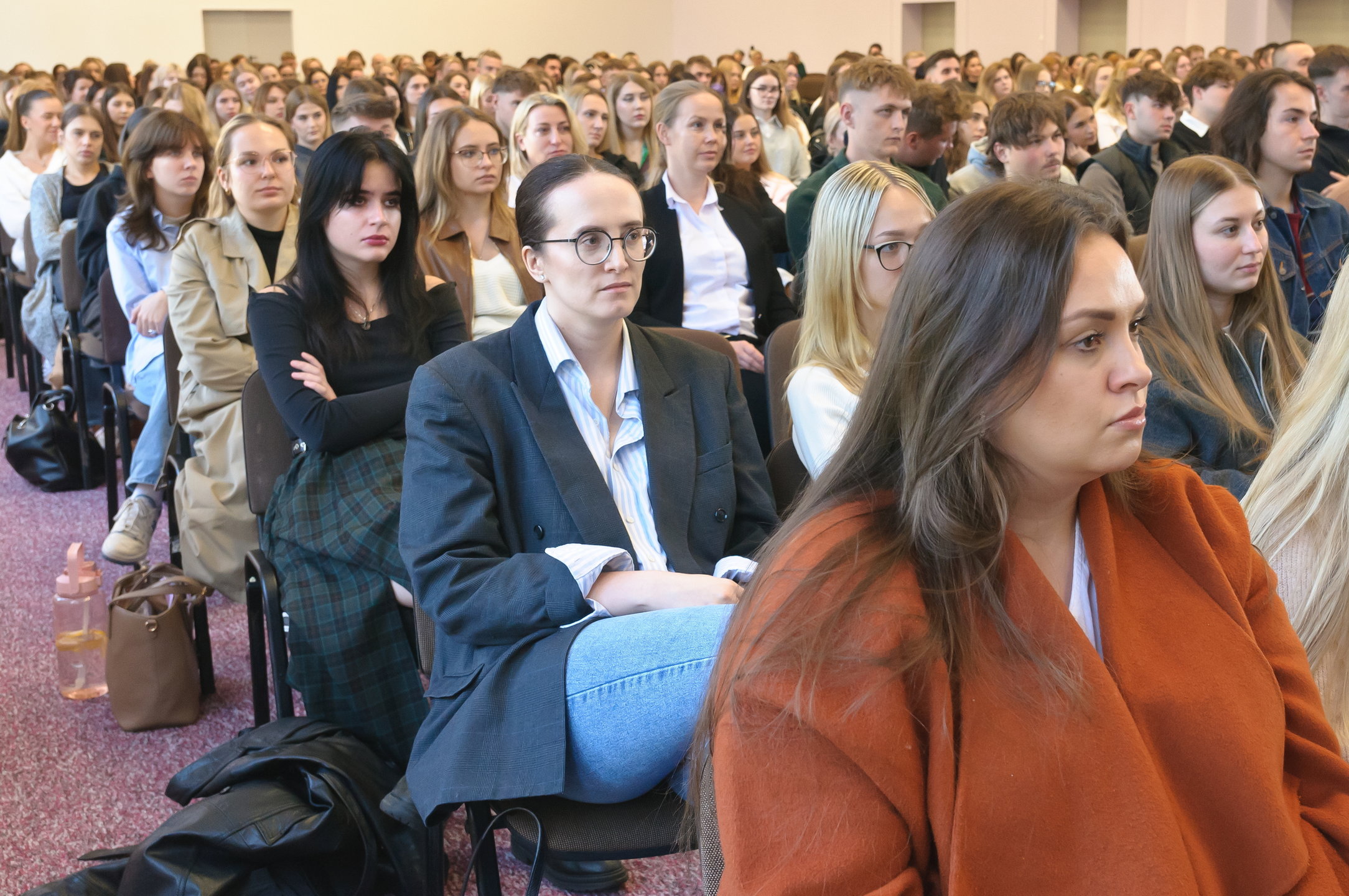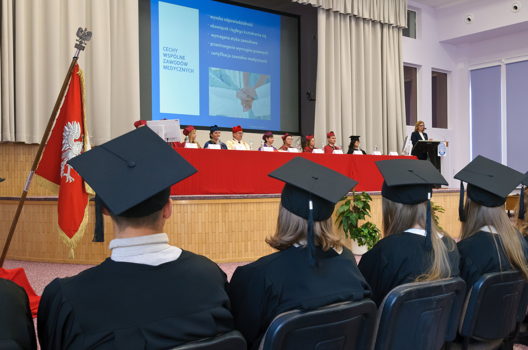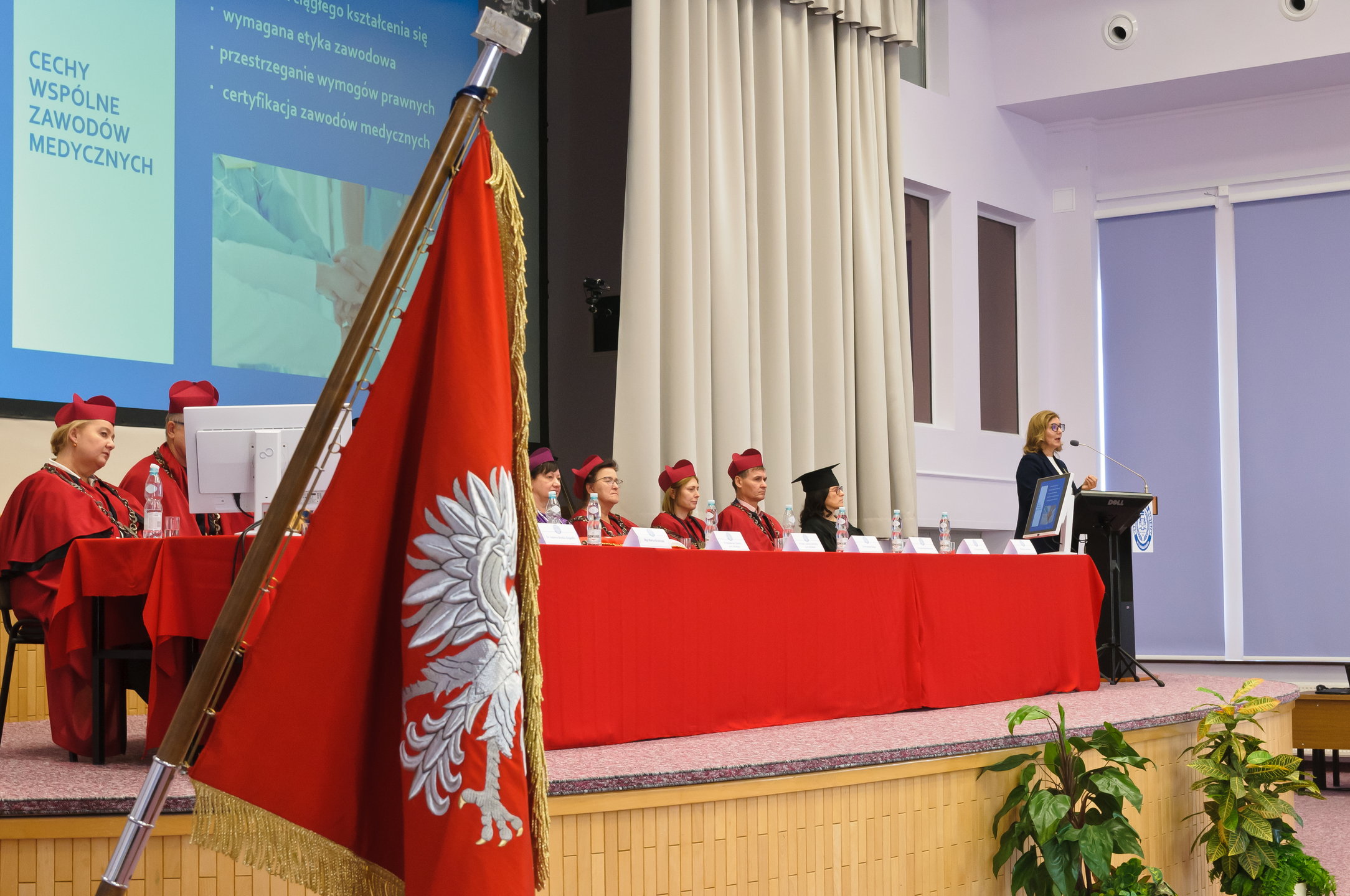 Studenci rozpoczynający trudną drogę studiów i pracy medyków usłyszeli także niezwykle cenny przekaz, którym był list skierowanych właśnie do nich przez p. Mariolę Łodzińską, Prezes Naczelnej Rady Pielęgniarek i Położnych. List odczytała prof. Joanna Jasińską - prorektor ds. dydaktycznych i rozwoju uczelni.